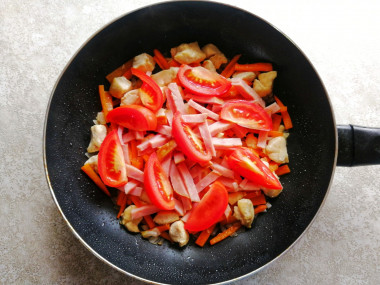 Добавьте в сковородку болгарский перец, копчёную колбасу и помидоры. При желании на этом этапе добавьте острый перец по вкусу. Обжаривайте всё ещё пять минут.