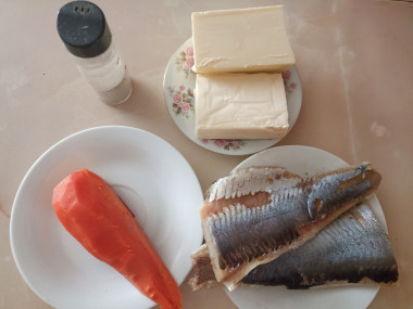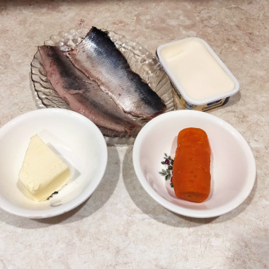 Как сделать намазку на хлеб из селедки? Подготовьте указанные ингредиенты. Сельдь лучше брать малосолёную, если рыба будет солёной, то количество масла или сыра нужно будет увеличить. Вес рыбы особого значения не имеет. Морковь предварительно отварите до готовности и остудите. Сливочное масло уберите в морозилку, чтобы легче было натереть его на тёрке. Плавленный сыр можно взять любой консистенции.