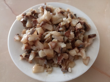 Тушку сельди промойте холодной водой и обсушите. Отрежьте голову и хвост. Срежьте брюшко и выньте внутренности. Аккуратно извлеките хребет и мелкие кости. Острым ножом порежьте филе сельди на очень маленькие кусочки. Сложите нарезанную селёдку в глубокую миску.