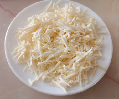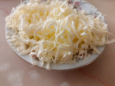 Добавьте плавленный сыр к остальным ингредиентам. Если сыр у вас плотным брикетом, то его также натрите его на крупной тёрке. Массу тщательно перемешайте. Если необходимо по вкусу, то её можно присолить, а также добавить чёрный молотый перец. На мой вкус она не требует дополнительных специй.