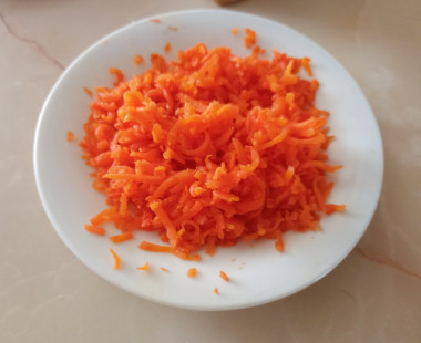 Предварительно отваренную и остывшую морковь очистите от шкурки. На средней или мелкой тёрке натрите морковь и положите в миску к ранее измельчённым ингредиентам.