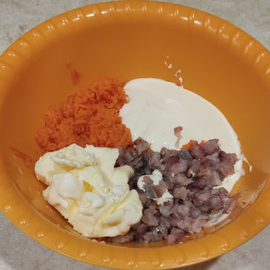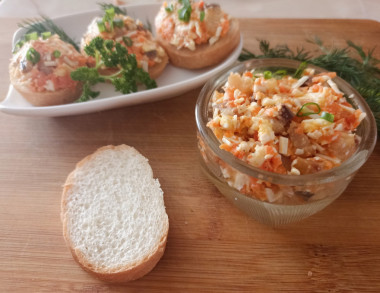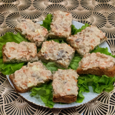 В салатнике смешала сельдь, морковь, масло, сыр плавленный. Кусочки хлеба немного подсушила на сковороде и сверху выложила намазку!