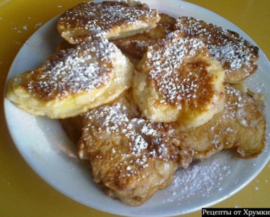 Получившуюся массу не спеша перемешиваю, поднимая тесто снизу вверх. Яблоки мою, очищаю от кожуры и сердцевины, нарезаю ровными кусочками толщиной около 0,5 мм, пересыпаю сахаром, оставляю их в покое минут на двадцать. Затем наливаю в сковороду масло, разогреваю его и вилкой выкладываю кусочки яблок, предварительно обмакивая их в тесте. На слабом огне поджариваю яблоки с обеих сторон до румяной корочки. Когда все яблоки обжарила, складываю их в форму для запекания и ставлю в духовку в разогретую до 180 градусов буквально на пять минут. Вынимаю яблоки, кладу их на блюдо, посыпаю сахарной пудрой. Эта еда вкусна, если к ней подать сметану, ягодный сироп или негустое варенье.