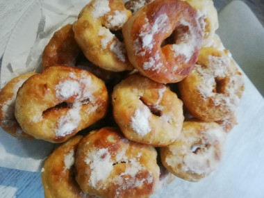 Переверните пончики на другую сторону и жарьте до готовности. Я жарила 5 минут. Так пожарьте все заготовки. Готовые пончики выложите на бумажное полотенце, чтобы оно впитало лишнее масло. Я посыпала выпечку сахарной пудрой, но это по желанию. Приятного аппетита!