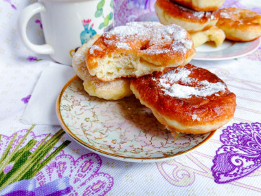 Пончики получились мягкие, пышные, очень ароматные. Сверху я посыпала их сахарной пудрой. Яркого дрожжевого вкуса у них нет. Они в меру сладкие, не приторные.