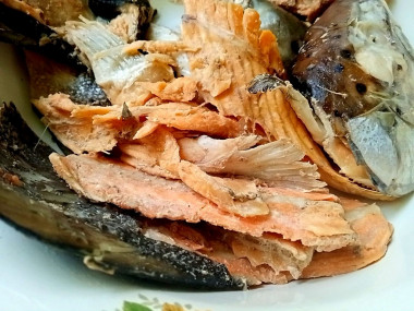 Красную рыбу тщательно промойте. Срежьте плавники. Рыбу нарежьте средними кусочками. В рыбе должно быть достаточно мяса. Поэтому лучше использовать филе. У меня был крупный хвост, которого хватило для супа. Если есть голова от рыбы, можете тоже добавить ее в суп. Рыбу посолите, поперчите.