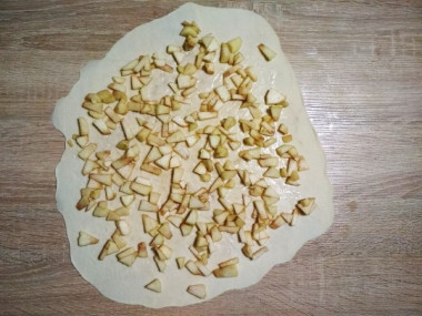 Намазать пласт теста яблочной начинкой.