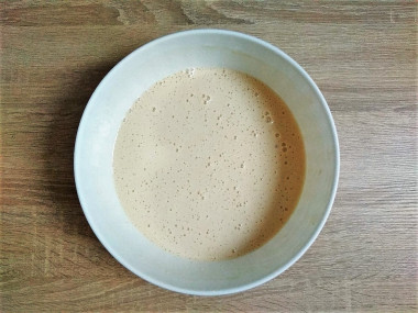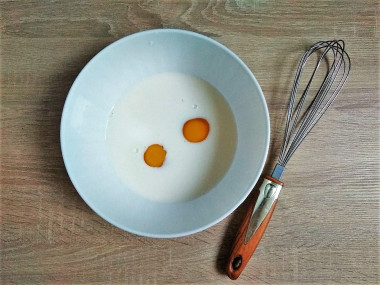 Для приготовления теста возьмите глубокую чашу, в которой будет удобно все перемешивать. В чашу разбейте яйца и добавьте немного сахара. Взболтайте их немного с помощью венчика.
