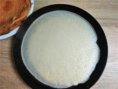 Готовое тесто должно быть достаточно жидкое, однородное, без комочков муки. Именно из жидкого теста будут получаться блины с дырочками. Выпекать их необходимо на очень горячей сковороде. Перед первым блином сковороду немного смажьте растительным маслом. Жидкое тесто наливайте на раскаленную сковороду и дайте ему растечься тонким слоем. Готовьте блинчики на среднем огне, обжаривая с двух сторон до золотистого цвета.