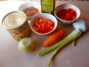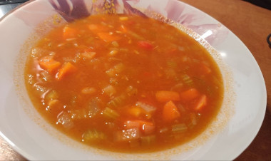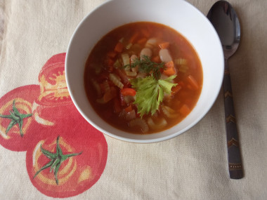 Готовлю суп фасолада греческий. Для ускорения процесса взяла консервированную белую фасоль. Поэтому немного изменила очередность: сначала в кипящую подсоленную воду отправила нарезанную мелким кубиком морковь, тем временем готовила зажарку из лука, сельдерея, помидоров и томата. Болгарский перец у меня был замороженный, его тоже отправила в зажарку, за пару минут до готовности. Морковь варила до полумягкости, чтобы она не потеряла форму, фасоль и зажарку опустила в кастрюлю одновременно. Всё вместе прокипятила примерно пять минут. Добавила специи и зелень по своему вкусу. Моя фасолада готова. Ароматная, с томатной кислинкой. Отличный вариант для постного стола и для желающих сохранить стройность. Спасибо, Ropotushka!