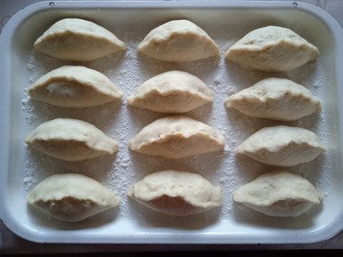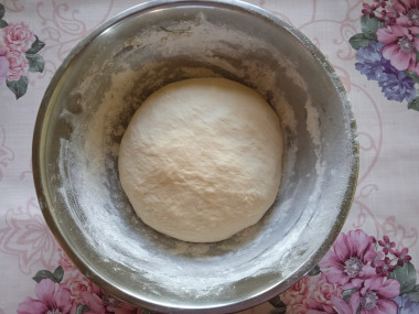 Замешанное тесто переложите в миску, присыпьте слегка мукой и отложите в сторону на полчаса, прикрыв салфеткой или полотенцем. Когда время выйдет, тесто обомните руками и можете начинать лепить пирожки.
