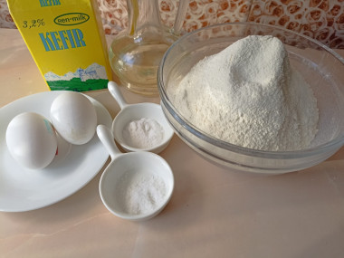 Как замесить тесто для беляшей на кефире без дрожжей? Поверьте, это совсем несложно. Подготовьте все необходимые ингредиенты. Кефир заранее достаньте из холодильника, он должен быть комнатной температуры. Муку просейте. Благодаря этому она насытится кислородом, и тесто получится нежнее. О свойствах муки читайте в отдельной статье по ссылке в конце рецепта.