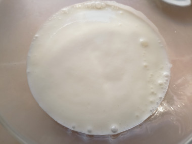 Возьмите миску для замеса и налейте кефир комнатной температуры. Добавьте соду, размешайте и оставьте на 5 минут. Кефир увеличится в объеме почти в 2 раза. О нюансах использования соды читайте в отдельной статье по ссылке в конце рецепта.