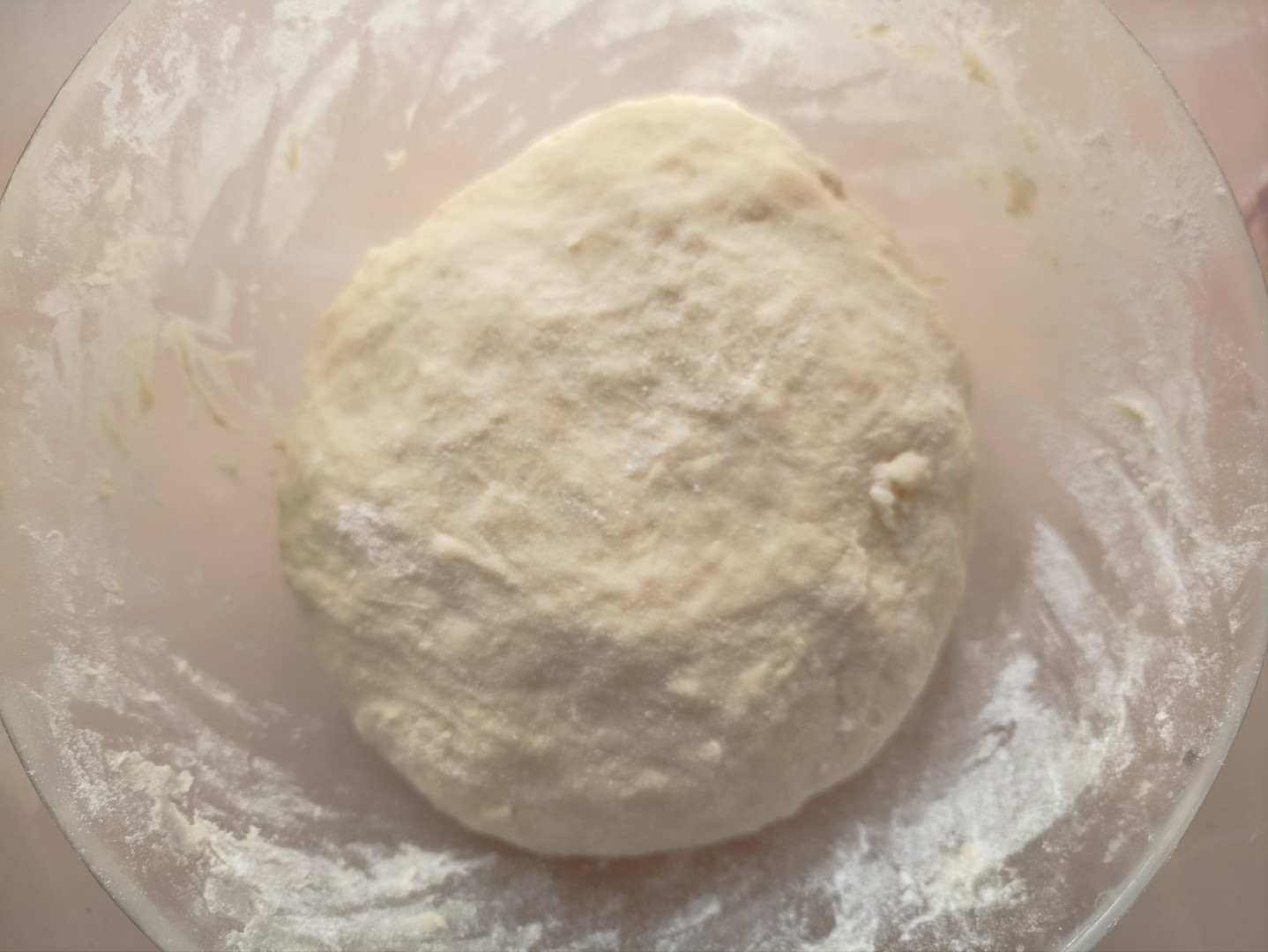 Муку добавляйте порционно. Размешивайте сначала лопаточкой, а потом уже перейдите на ручной замес. Муки может понадобиться чуть больше или чуть меньше в зависимости от качества, размера яиц и жирности кефира Тесто должно получиться мягким, слегка липнущим к рукам. Накройте тесто пищевой пленкой или сухим, чистым полотенцем и оставьте "отдохнуть" на 30 минут.