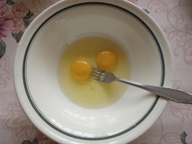 В глубокой чаше соедините яйца с сахаром и солью. Слегка их перемешайте с помощью венчика. Добавьте растительное масло. Обязательно мойте яйца перед использованием, так как даже на кажущейся чистой скорлупе могут находиться вредные бактерии. Лучше всего использовать моющие средства для пищевых продуктов и щетку.