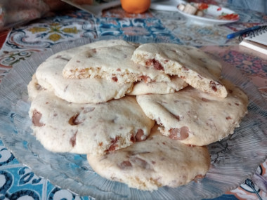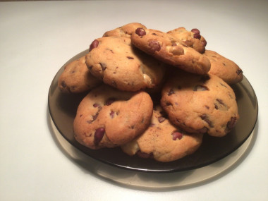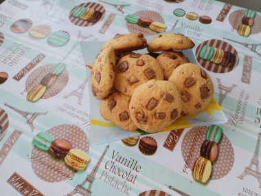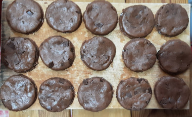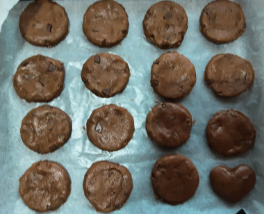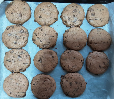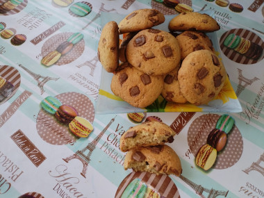 Сделала с шоколадом "кофе с молоком". И очень хотелось добавить арахис:) Получилось вкусное, не приторное печенье. Такое, как хотела. Только я его, видимо, пересушила - вышло хрустящее. Пекла 10 минут при 180 градусах.
