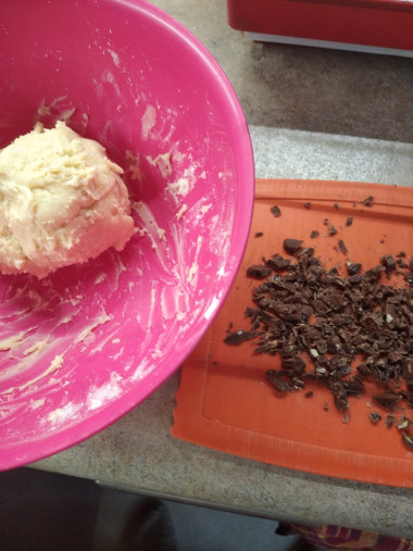 Сразу после того, как тесто стало нужной консистенции, добавьте шоколадную крошку. Еще раз быстро перемешайте для равномерного распределения шоколада по всему тесту.