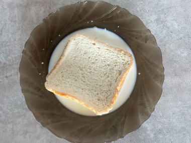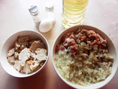 В миску переложите мякиш белого хлеба или поломанный на кусочки батон, залейте молоком и оставьте на 15 минут для разбухания хлеба. Столовой ложкой, вилкой или блендером перемешайте размокший в молоке хлеб. Добавьте размокший мякиш в миску с фаршем и луком. Хорошо перемешайте.