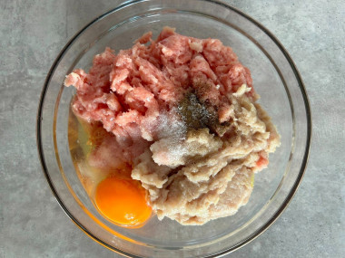 Вбейте в фарш сырое куриное яйцо. Добавьте соль и черный молотый перец по вкусу. Тщательно перемешайте ингредиенты, чтобы получилась однородная по консистенции масса.