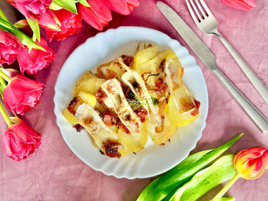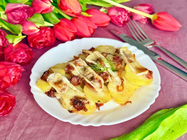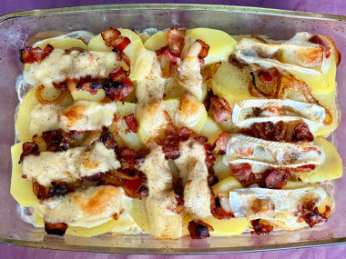 Нежная, сочная, мягкая картошка! Просто тает во рту! По этому рецепту получается вкусное блюдо под сырной корочкой. Праздничный Тартифлет французский, запеченный в духовке я делала с сыром Бри. Это бесподобно! Большое спасибо автору рецепта!