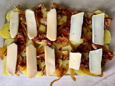 В традиционном блюде принято использовать мягкий французский сыр Реблошон (Reblochon), найти его на прилавках магазина не всегда удаётся, поэтому можно заменить на сыр Бри либо Камамбер. Нарежьте сыр произвольными кусочками. Как правильно заменять сыры читайте в отдельной статье в конце рецепта.