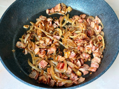Добавьте к луку бекон и обжарьте всё вместе минуты две-три (до момента когда бекон подрумяниться).