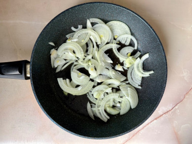Чеснок очистите от шелухи, нарежьте тонкими пластинка или кубиками, или же пропустите через пресс и добавьте в сковороду. Впрочем, по желанию можете исключить его из списка ингредиентов вовсе.