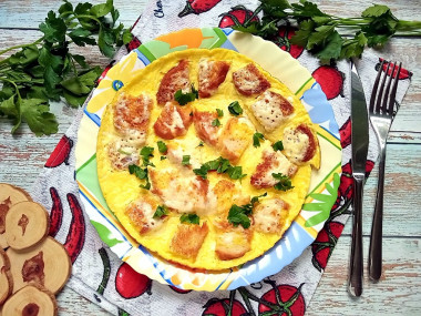 Батон нарезала средними кусочками и обжарила одну сторону. Белый хлеб жарится очень быстро, советую не отходить далеко от плиты. Затем кусочки перевернула и сверху вылила омлетную смесь. Огонь сделала меньше среднего, а сковороду накрыла крышкой. Очень скоро у меня уже был готов вкусный и пышный омлет! Кусочки поджаренного хлеба почти полностью стали мягкими и нежными. Вообще весь омлет воздушный и мягкий. Нам он очень понравился! Горячий сыр тянется, что прибавляет аппетита!