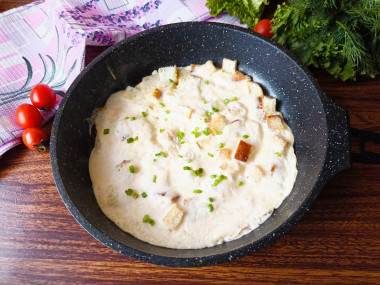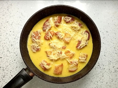 Теперь влейте омлетную смесь прямо на кусочки хлеба, уменьшите огонь до минимального, чтобы за время готовки омлет не подгорел, накройте сковороду крышкой и готовьте омлет 8-10 минут, после чего снимите сковороду с огня и дайте отдохнуть омлету д крышкой еще 3-4 минуты.