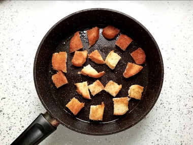В сковороду налейте растительное масло и на ее дно выложите нарезанный хлеб, равномерно распределяя его по всему периметру сковороды. Сковороду с хлебом подставьте на сильный огонь и обжаривайте хлеб с одной стороны в течение 2-3 минут до золотистой румяной корочки, переверните кусочки хлеба. О том, как подобрать идеальную сковороду, а также как правильно выбрать растительное масло, читайте в отдельных статьях, ссылки в конце рецепта.