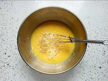 Натрите сыр на мелкой или средней терке, если натрете на мелкой терке, то в итоге получится более нежный на вкус омлет. Натертый сыр добавьте в емкость к яично-молочной смеси, посолите, при желании добавьте другие специи и хорошо все перемешайте.
