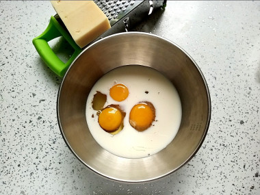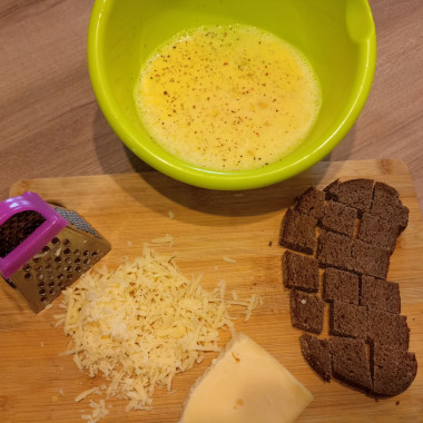 Готовила из расчета на 3 яйца. Они были небольшого размера, поэтому молока взяла 125 мл. Сыр у меня голландский, натерла его на средней тёрке.