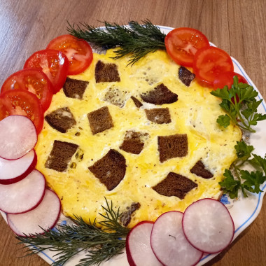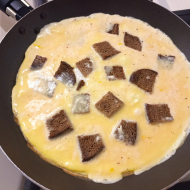 На завтрак приготовила омлет с хлебом на сковороде. У меня был батон, нарезала его кубиками и обжарила на растительном масле до зарумянивания, затем залила молочно- яичной смесью с натёртым сыром. Жарила омлет под крышкой на слабом огне. Получилось очень вкусно! Кусочки батона получились мягкими, но предварительная обжарка придает им приятный ореховый привкус, вкупе с сыром получается очень интересное сочетание. Просто, но вкусно! Спасибо автору!