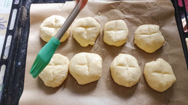 Когда тесто поднялось, переложите его на горизонтальную рабочую поверхность, посыпанную мукой. Разрежьте при помощи посыпанного мукой ножа на 12 одинаковых кусочков. На противень размером примерно 40х40 см застелите бумагу для выпечки. Сухими посыпанными мукой руками сформируйте круглые булочки, выложите их на бумагу и оставьте подниматься еще на полчаса. Включите духовку разогреваться до 180°С.