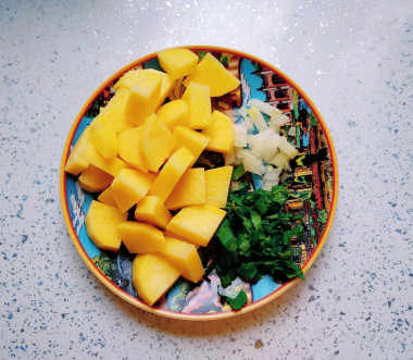В это время картофель, вторую луковицу и чеснок очистите от кожуры, вымойте в чистой воде. Зелень ополосните. С выбором специй и пряностей, а также сорта картофеля вам помогут статьи под рецептом.