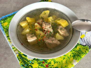 Когда свинина станет мягкой, выловите вареную луковицу из бульона. Пламя увеличьте. Отправьте картошку в кастрюлю и добавьте несколько горошин чёрного перца. После повторного закипания плиту убавьте до умеренного и варите суп до готовности картофеля. На это уйдет от 20 до 30 минут. Варите до тех пор, пока при надавливании, картофель легко будет разламываться.