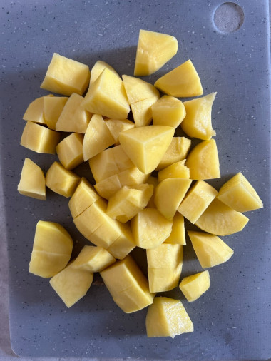 Картофель нарежьте примерно такими же кусочками, как и мясо. При этом форму и размер нарезки любого продукта вы всегда можете адаптировать под свои предпочтения.