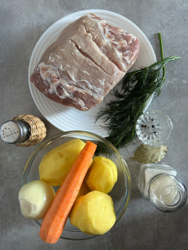 Шулюм из свинины в домашних условиях готовила в первый раз. Количество порций уменьшила благодаря калькулятору. Свинину взяла с жирком, порезала на крупные кусочки, залила водой и поставила на огонь, после закипания сняла пену, посолила и добавила целую очищенную луковицу, 1 морковь и лавровый лист. Когда мясо было готово достала лук и морковь, добавила крупно нарезанный картофель, перец горошком и варила до готовности. Мелко нарезала лук, чеснок пропустила через пресс, отправила в кастрюлю на 1 минуту, убрала с огня и накрыла крышкой, дала настояться 30 минут. Мелко нарезанный укроп подавала отдельно. Очень наваристый и вкусный бульон получился, мясо хорошо сварилось и стало мягким и нежным. Благодарю автора за рецепт.