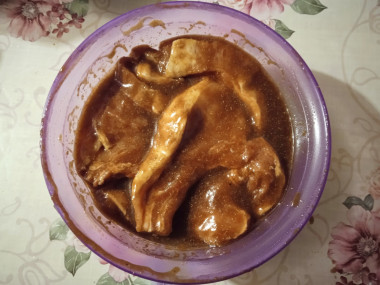Как приготовить маринад? Для этого в мисочке соедините соевый соус, оливковое масло, кетчуп и черный молотый перец. Соль я не добавляю, так как соевый соус достаточно соленый.