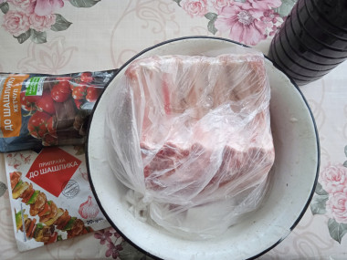 Для чалагача нам понадобится свинина на кости, причем определенные ее части: мясо с реберной костью. Кость может быть длинная или обрубленная, как у меня. В разных магазинах эта часть может называться по-разному: свиная котлета на кости, корейка на кости, антрекот на кости. Поэтому ориентируйтесь на внешний вид: это должна быть приблизительно овальная часть мякоти, частично окруженная костью. Свинину тщательно промойте и обсушите бумажными полотенцами.