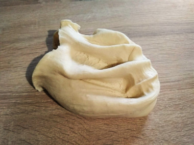 Замешивайте тесто около 10 минут, пока оно не станет гладким и эластичным, и практически перестанет липнуть к рукам. У меня на данное количество продуктов ушло чуть больше трех стаканов муки.