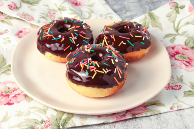 Остывшие пончики окунайте с помощью вилки одной стороной в глазурь. Сверху украсьте по своему желанию. Я посыпала кондитерской посыпкой.