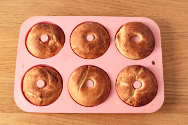 Выпекайте пончики в духовке, заранее разогретой до 190°С 15-20 минут, режим верх-низ. На фото видно, что при данном способе формирования дырка в середине практически пропала, так как пончики очень сильно выросли при выпечке.