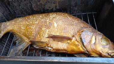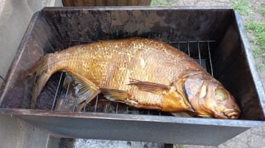 В мангале разведите огонь, он должен быть средней интенсивности и установите на нее коптильню. Коптите леща в течение 30-40 минут после того, как из коптильни появится дымок. Поддерживайте небольшой огонь в течение всего приготовления рыбы. Можно 1-2 раза снять аккуратно крышку и убрать конденсат, так как при попадании на рыбу он дает горечь.