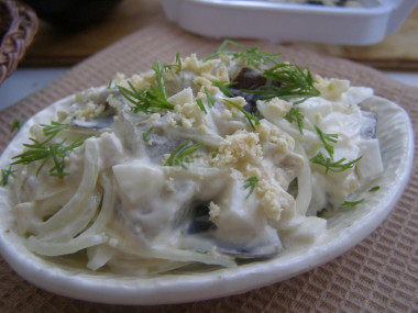Отварные яйца очистите от скорлупы, нарежьте и также отправьте в салат. Следом добавьте маринованный лук. Заправьте салат небольшим количеством майонеза и хорошо перемешайте.