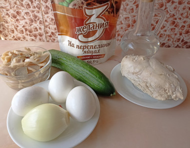 Любимый салат с курицей и консервированными шампиньонами, спасибо. Смотрите и такой вариант.