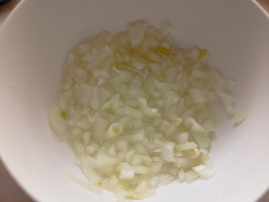 Первым делом замаринуйте лук. Для этого лук мелко нарежьте и залейте уксусом. Дайте постоять минут 10. Затем уксус слейте, а лук промойте водой. Маринованный лук придаст готовому салата неповторимый вкус.