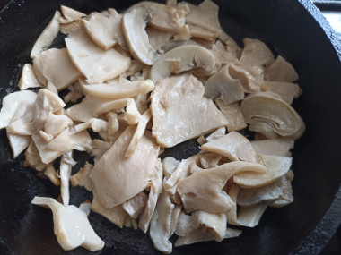 Шампиньоны можно брать как уже нарезанные, так и в целом виде. Если они очень крупные, то их разрежьте на 4 части. Нарезанные шампиньоны добавьте в чашу к салату.