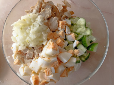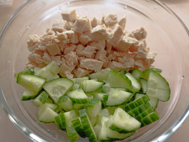 Огурец нарежьте небольшими кусочками и добавьте в чашу к куриному мясу. Выбирайте сами, очищать огурцы от кожицы или нет. Я этого не делала.
