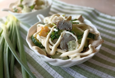 К ужину решила приготовить салат с шампиньонами консервированными курицей и огурцом. Куриную грудку заранее отварила в подсоленной воде с добавлением лаврового листа и горошинами черного перца. Яйца также отварила пораньше, чтобы к моменту нарезки салата они полностью остыли. Репчатый лук замариновала в 9% уксусе. Все ингредиенты нарезала ( шампиньоны уже были нарезанные), соединила в салатнике, добавила майонез. Получился сытный, но не тяжёлый салат. Ингредиенты хорошо сочетаются друг с другом, маринованный лук добавляет пикантную нотку. При подаче посыпала салат мелко нарезанным зелёным луком. Спасибо за рецепт, Юлия М! С удовольствием буду готовить этот салат ещё.